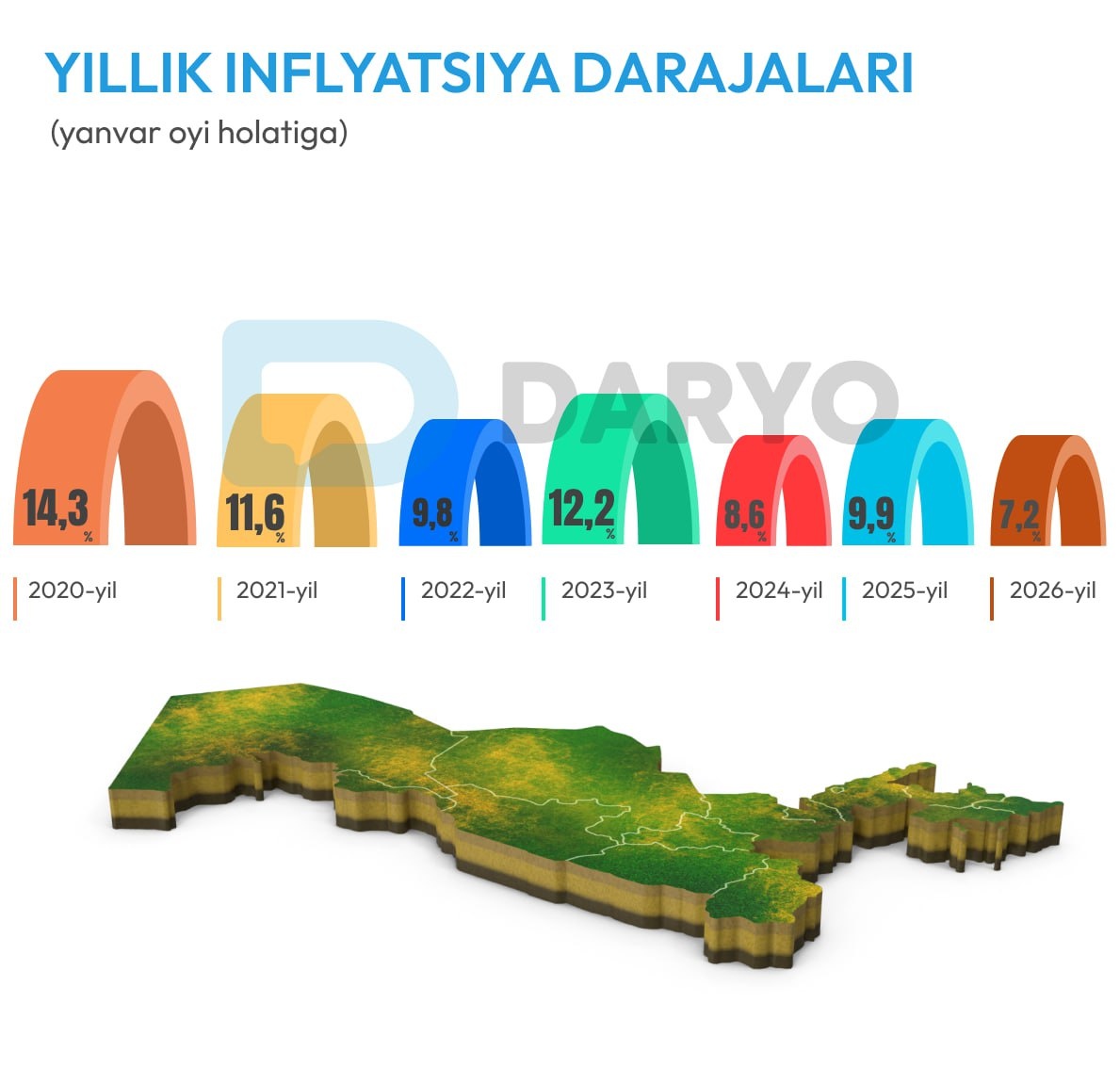 2026-yil yanvarda yillik narxlar oʻsishi 7,2 foizni tashkil etdi. Oʻtgan bir yilda qoʻy goʻshti (27,2 foiz), mol goʻshti (23,8 foiz), metan (30,2 foiz) keskin qimmatlashgan. @daryolive