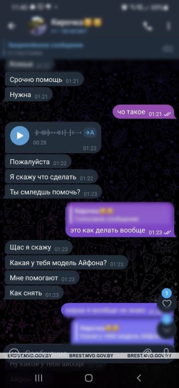 #Милиция_Брестчины #Мошенничество ✍🏻В регионе продолжают фиксировать случаи, когда мошенники вымогают деньги за «разблокировку» iPhone. 📲16-летней школьнице из Бреста в мессенджере Телеграм написала подруга, аккаунт которой взломали мошенники. Девушка сначала уточнила, какая модель и марка мобильного у подруги, а затем попросила помочь ей, мотивируя это тем, что с ее телефона произвести такие манипуляции нет возможности. ➡️Доверчивая брестчанка вошла в чужую учетную запись по предложенным данным. После чего сразу потеряла доступ к своей. Практически сразу она получила сообщение с требованием перевести около 240 рублей в эквиваленте для дальнейшей разблокировки своих данных. 📞В милицию также обратился 21-летний житель Бреста: неизвестный путём обмана заблокировал и частично ограничил функции принадлежащего ему мобильного телефона и требовал для разблокировки денежную сумму в размере 600 рублей. Установлено, что молодой человек начал переписываться с девушкой на сайте знакомств.