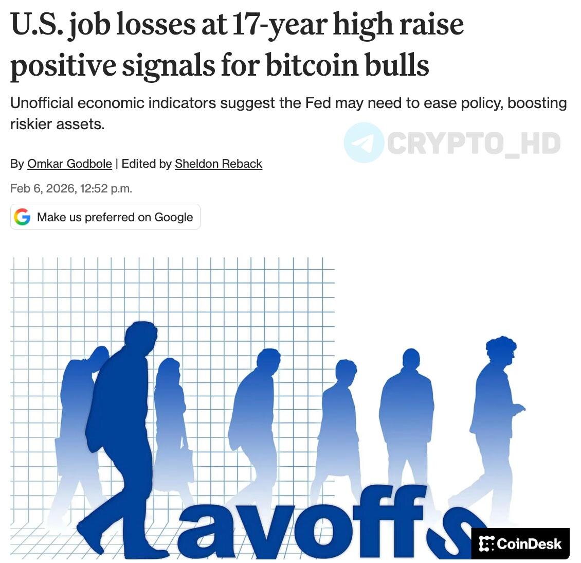 ➥ Компании готовят массовые увольнения, в январе было объявлено о планах по сокращению 108 тысяч человек – в 3 раза больше, чем месяцем ранее. Максимум с 2009 года, когда рухнул Lehman Brothers. ➥ Больше всего режут в техе: Amazon и UPS анонсировали десятки тысяч увольнений. Планы готовили еще в конце 2025 года – значит, бизнес не верит в хороший 2026 год. ➥ Официальная статистика занятости пока держится, но частные данные уже сигналят о проблемах. Truflation (блокчейн-платформа) показывает инфляцию ниже 1%, хотя по официальным данным она все еще выше 2%. ➥ Слабый рынок труда + снижение инфляции = давление на ФРС, необходимость снижать процентную ставку, чтобы не угробить экономику. А это исторически разгоняет рисковые активы. ➥ BTC сейчас вдвое ниже ATH ($126k). Если ФРС развернется к смягчению ДКП – может быть отскок. Crypto Headlines