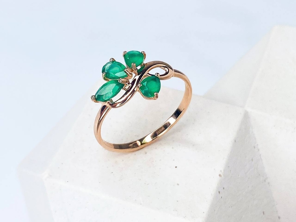 Основа украшений выполнена из розового золота 585 пробы, которое дает теплый нежный блеск и прекрасно оттеняет зеленые камни. 8 искусственных агатов разного размера на серьгах и 4 на кольце искусно размещены на изогнутых золотых завитках, создавая эффект цветущей веточки. Камни имеют красивую огранку, благодаря которой они переливаются и сверкают при каждом движении.