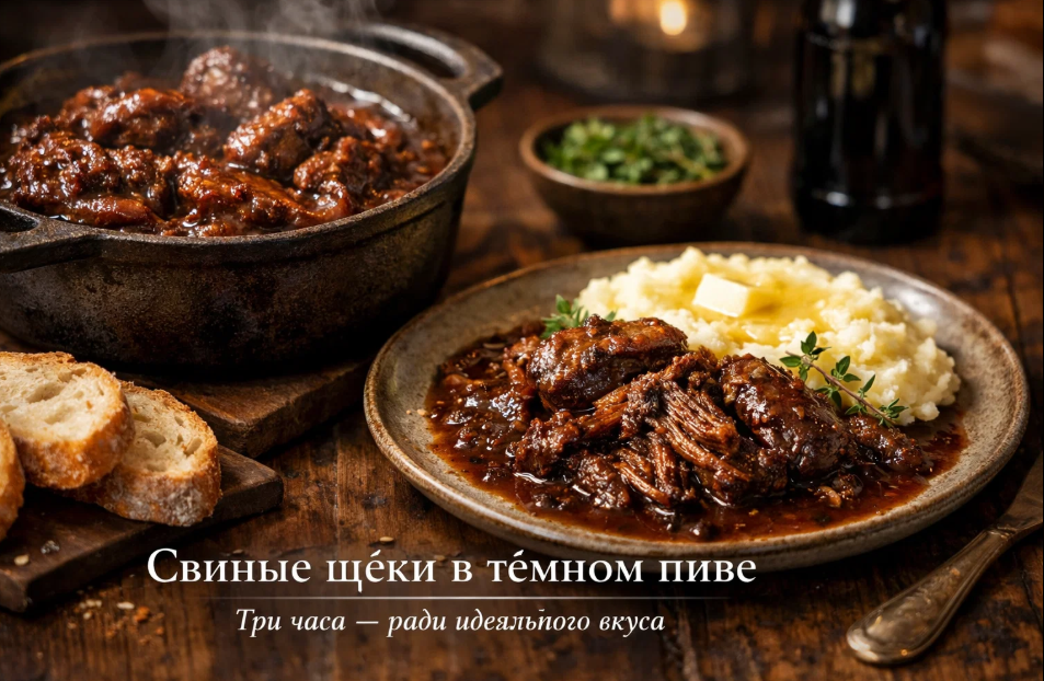 Есть блюда, которые готовятся за пятнадцать минут, и ты сразу садишься за стол. А есть такие, ради которых нужно выделить полдня, запастись терпением и просто ждать. Свиные щёки в тёмном пиве относятся ко второй категории. Но поверьте — каждая минута ожидания того стоит. Когда через три часа томления вы достанете из духовки казан, а мясо начнёт распадаться от одного прикосновения вилки, вы поймёте, что такое настоящая кулинарная магия.