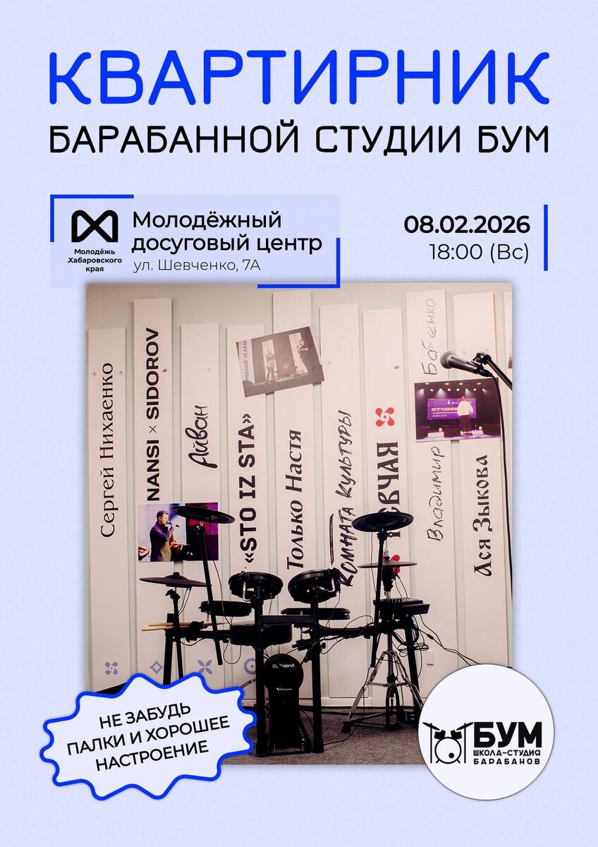 ? 🎸 Это не концерт и не урок — это вечер, где: 🤎Играют на барабанах и не только 🤎Поют любимые песни 🤎Знакомятся, смеются и наслаждаются музыкой 🤎И просто классно проводят время вместе Мы и школа-студия игры на барабанах и гитаре «БУМ» ждём тебя 8 февраля в 18:00 в Молодёжном досуговом центре (г. Хабаровск, ул. Шевченко, 7А) 🌟 🎨 Молодёжь Хабаровского края в MAX #креатив27