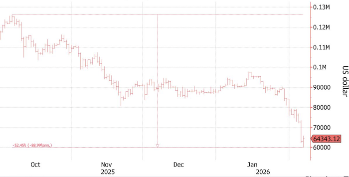 Биткоин подешевел на 50% относительно пика, достигнутого в октябре 2025 года. Источник: Bloomberg