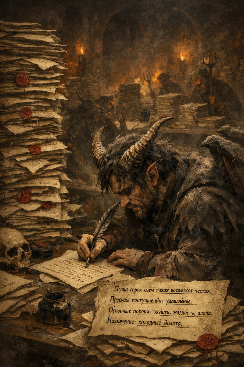 Акакий служил в учётном отделе. Он не рвал души, не сдирал кожу, не топил грешников. Он считал. Считал грехи. Считал приговоры. Считал вечности.