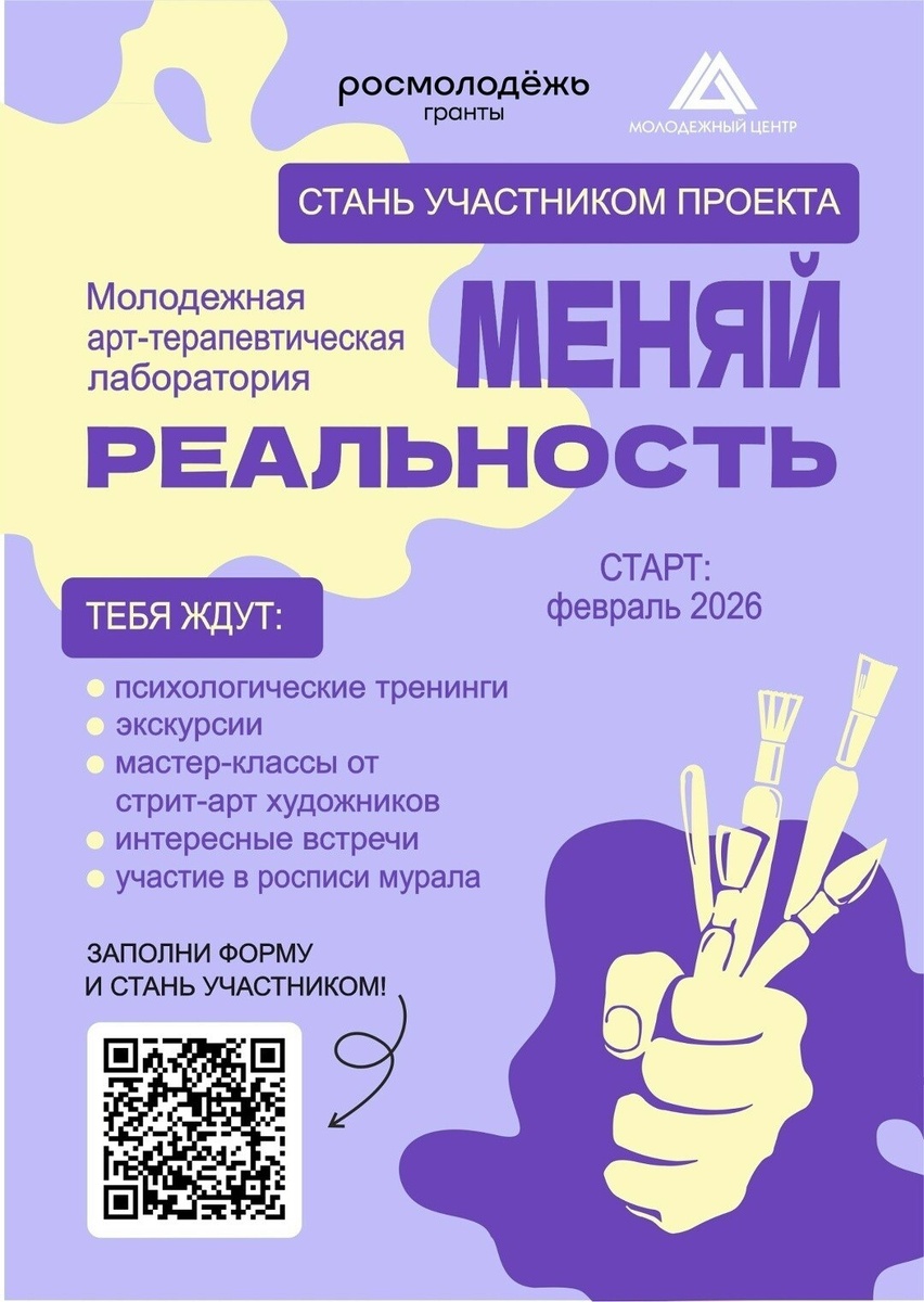 ! Молодежный центр ищет участников для своего нового проекта «Молодёжная арт-терапевтическая лаборатория «Меняй реальность». Здесь каждый сможет найти поддержку и раскрыть творческий потенциал. В программе: ✅ психологические тренинги, которые помогут разобраться в себе; ✅ экскурсии по интересным местам города и новые знакомства; ✅ мастер-классы от стрит-арт-художников; ✅ увлекательные встречи с творческими людьми; ✅ возможность принять участие в создании настоящего мурала, который станет украшением Молодежного центра Чтобы присоединиться к проекту, нужно заполнить форму: clck.ru/3Rdgxm. Участвовать могут саровчане в возрасте от 14 до 20 лет. Подробности по телефону 99-112. Участие бесплатное. Проект реализуется при грантовой поддержке Федерального агентства по делам молодежи Росмолодёжь .