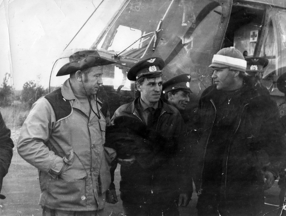 Космонавты Леонов А.А. (слева) и Шаталов В.А. (справа) рядом с вертолетом Ми-8.