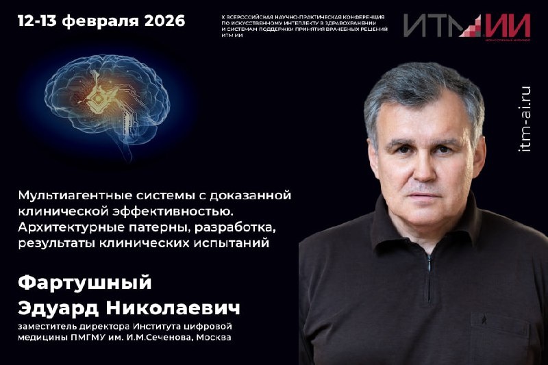 ограниченностью данных. Телемедицина сталкивается с вызовами масштабирования, а классические ИИ-системы обычно фокусируются на узких задачах без глубокого клинического обоснования. Конкурс AI'm Doctor показал пробелы в решениях с объяснимой диагностикой. На помощь приходят мультиагентные системы, такие как RC.Sechenov.AI. Участников и гостей «ИТМ ИИ» с нею познакомит заместитель директора Института цифровой медицины ПМГМУ им. И.М.Сеченова, д.т.н., проф. Эдуард Фартушный. Он также расскажет о результатах клинической апробации этой мультиагентной системы цифрового референс-центра на базе LLM. Спойлер: она доказала свою эффективность как инструмент поддержки принятия решений на этапе первичной диагностики. Ее модульная архитектура, интеграция с верифицированными клиническими знаниями и способность работать при дефиците данных делают ее готовым решением для масштабирования экспертной пульмонологической помощи по всей территории РФ. Не пропустите: 13 февраля пленарное заседание 2.1. Прим