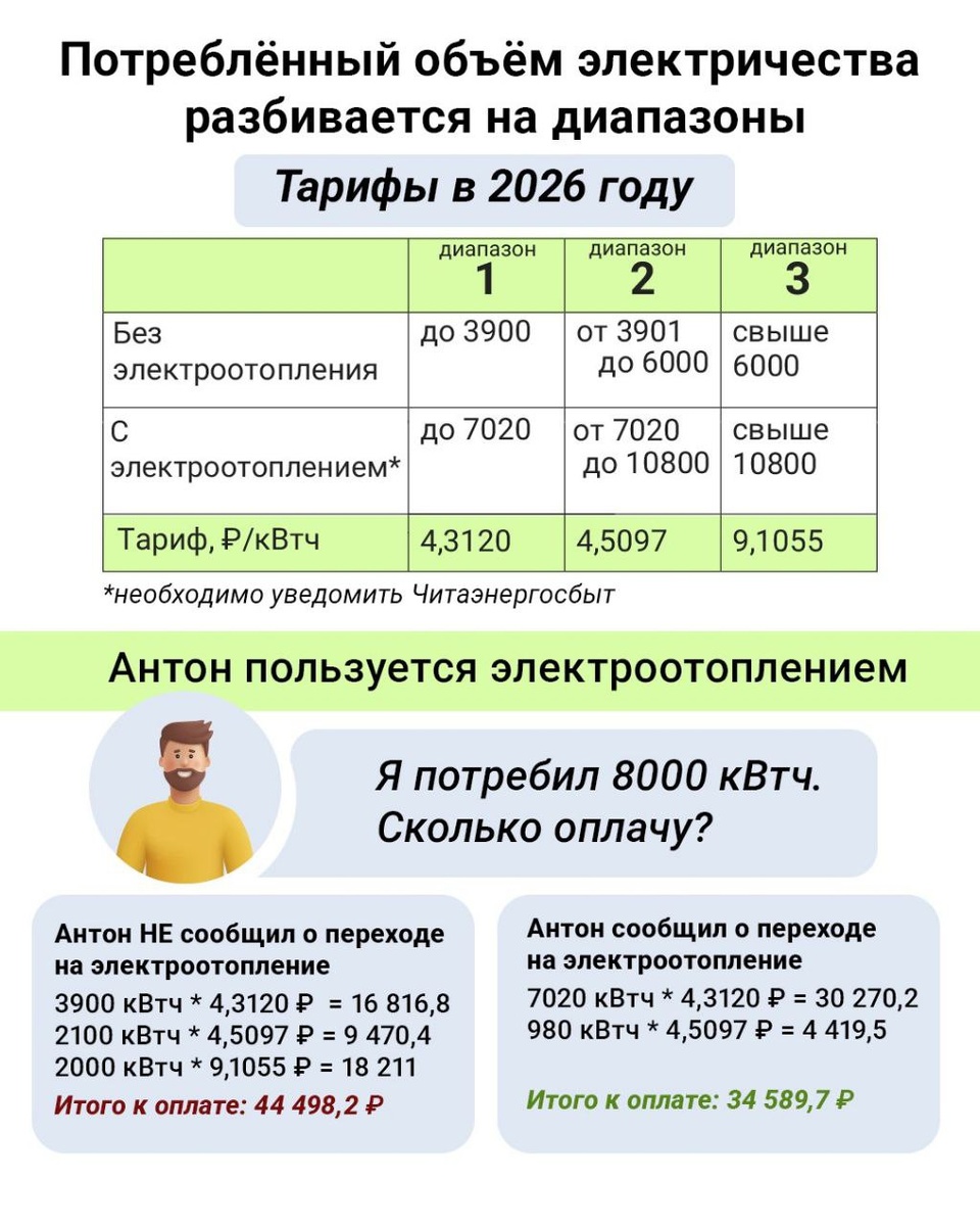 С начала 2026 года в Бурятии действуют новые тарифы на электроэнергию. Это особенно важно для владельцев домов с электроотоплением. ⭕️Ключевое условие для получения расчётного тарифа — нужно официально подтвердить, что дом отапливается электричеством. Для этого необходимо подать заявление в «Читаэнергосбыт». ⚫️После этого для вашего дома будут действовать специальные, увеличенные лимиты потребления, что делает оплату более выгодной по сравнению с обычными нормативами. 💡Энергетики отмечают, что новая система расчётов сохраняет прозрачность для большинства жителей. ⭕️Чтобы платить точно за фактически израсходованную электроэнергию, важно ежемесячно передавать показания счётчика в установленные сроки. ⭕️Подать информацию можно в мобильном приложении или на сайте в личном кабинете.