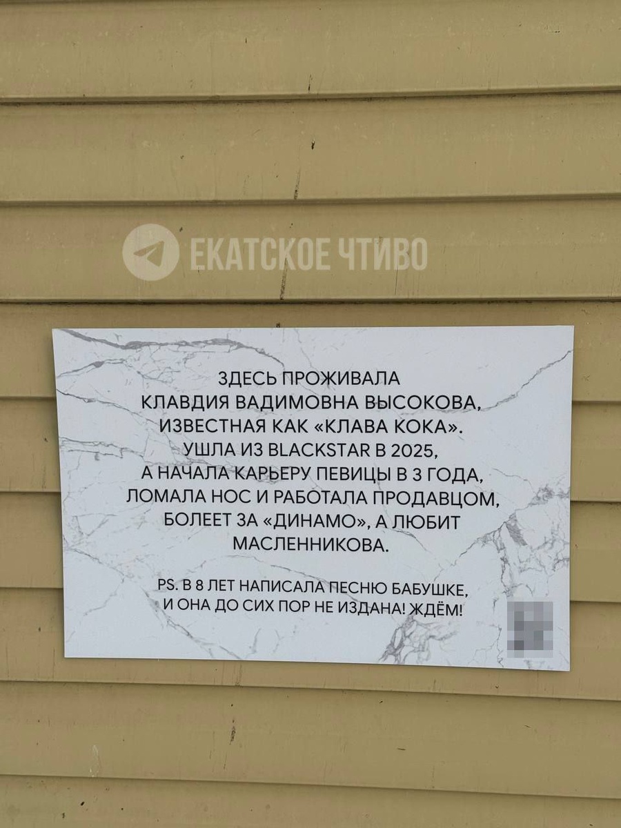 Как будто речь идет о великом писателе, здесь коротко перечислены все основные вехи в биографии екатеринбургской певицы — от первой песни, написанной в 8 лет, до ухода с Black Star. Очевидно это не искренняя инициатива жителей и, уж тем более, не чиновников. В углу таблички есть qr-код, который ведет на сайт местного PR-агентства, предлагающего агрессивные стратегии по раскрутке личного бренда. Нужна ли такая раскрутка самой Клаве — вопрос открытый. 🫡 Подписаться | Прислать новость | Дать «буст» | Мы в МАХ