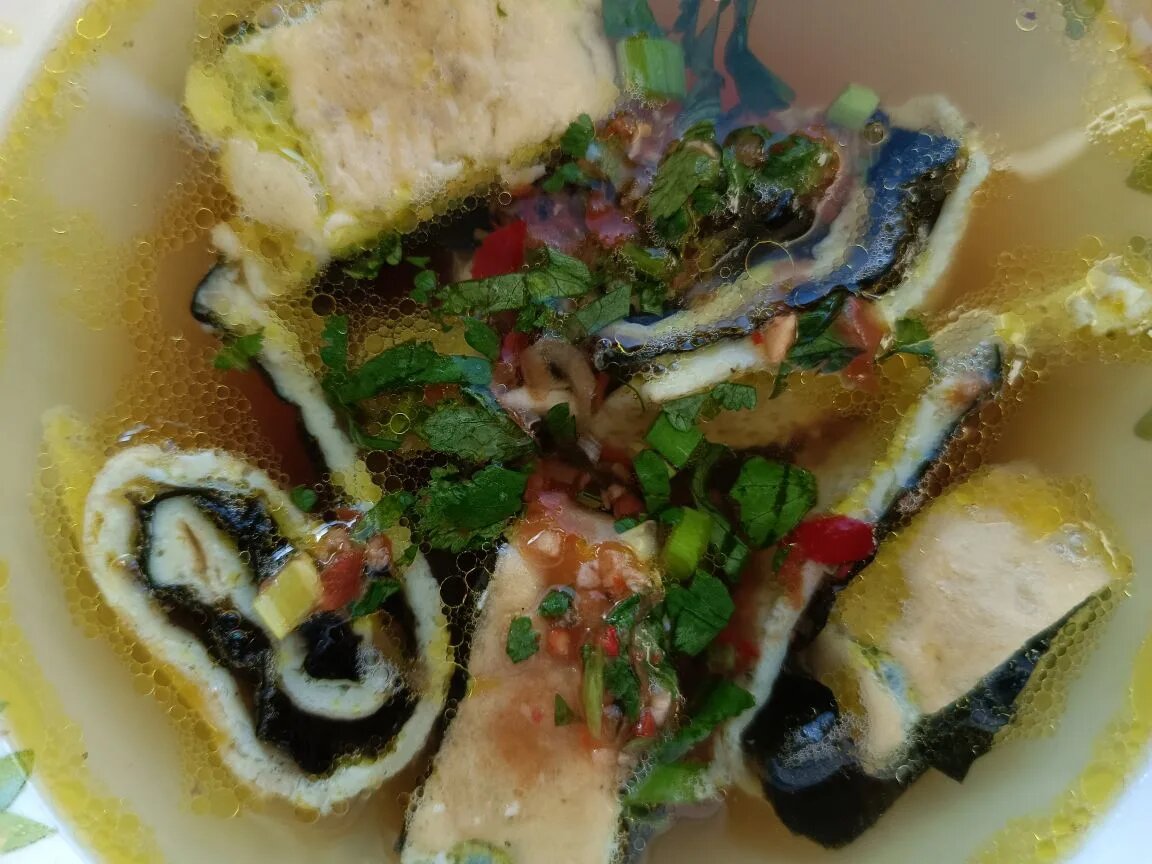 Рассказываем, как из двух ингредиентов приготовить быстрое блюдо, которое может быть завтраком, холодной закуской и наполнителем для супа. Понадобятся яйца, лист сушеных водорослей нори и большая сковородка с антипригарным покрытием. Если под рукой нет сковороды около 25-28 см в диаметре, стандартный лист нори можно слегка подогнать по размеру, обрезав уголки. Из зелени лучше всего подойдет зеленый лук (1-2 перышка мелко покрошить). Солить яйца не надо, соли из водорослей будет достаточно. Шаг 1. Яйца размешать, но не взбивать до пены. Можно процедить для более равномерной консистенции. Добавить немного измельченной зелени по желанию – 2-3 столовые ложки. Шаг 2. Вылить яйца на смазанную маслом сковороду, дождаться, когда болтушка схватится. Затем выложить сверху лист нори и с помощью лопатки свернуть яичный блинчик в рулет. Шаг 3. Прогреть под крышкой пару минут на медленном огне. Дать остыть и нарезать на тонкие ломти. Подавать яичный ролл с кетчупом или другим кислым соусом. Подойдет