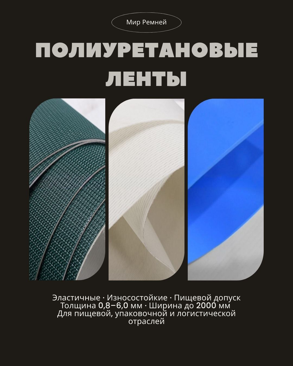 📌 Характеристики: • Материал: полиуретан (ПУ) 85–95 Shore A • Толщина: 0,8–6,0 мм (однослойные и многослойные) • Ширина: от 20 до 2000 мм (нарезка по заказу) • Покрытие: гладкое, рифлёное, грип, супергрип, вакуумное • Температура: –30…+80 °C (до +100 °C кратковременно) • Допуск: FDA/EU для пищевых продуктов 🟢 Преимущества: • Высокая эластичность и стойкость к порезам/проколам • Отличная адгезия к продукту (не скользит даже влажный) • Легко свариваются бесконечно на объекте • Не впитывают влагу, масла и запахи • Долговечность в 2–4 раза выше ПВХ-лент в агрессивных средах 📦 Области применения: • Пищевое производство (мясо, рыба, молочка, кондитерка) • Упаковочные