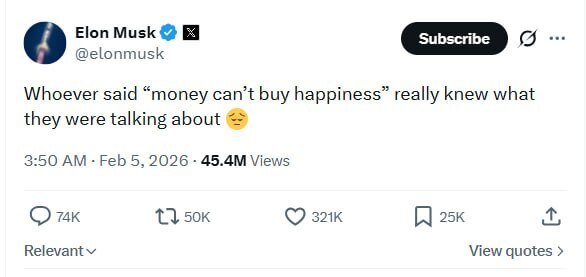Мир замер в благоговении. Илон Маск, человек, который заставил ракеты садиться на хвост, а электрокары — летать, совершил новое историческое открытие. Оказывается, за деньги счастья не купишь. Эту глубочайшую мысль, достойную статуса в соцсетях тринадцатилетней школьницы, он опубликовал в своей сети X ровно на следующий день после того, как его состояние перевалило за отметку в 800 миллиардов долларов. Счастье в шалаше (с видом на Марс) Активы Илона взлетели в стратосферу после слияния SpaceX и xAI. Пока Forbes судорожно пересчитывал нули в его капитале, сам виновник торжества, видимо, сидел в глубокой меланхолии. Ведь это так тяжело — осознавать, что ты первый человек в истории, чье личное состояние может обеспечить колонизацию пары планет, а счастья в душе всё нет и нет. В этом и заключается высшая степень троллинга мирового масштаба. Только представьте: человек, чье состояние выросло благодаря слиянию компаний по производству искусственного интеллекта и межпланетных кораблей, учит