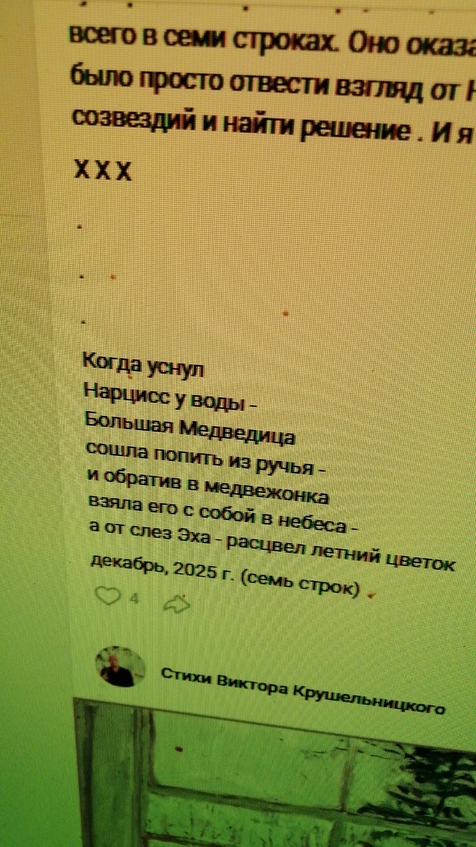 . . . Что получилось у меня по настоящему в 2025 году? Я наконец нашел решение, над которым размышлял лет с двадцати. Никогда меня не устраивал древнегреческий миф о Нарциссе . Насколько мне нравился миф об Ио, о Персее и Горгоне, и особенно об Аполлоне и Артемиде как Близнецах, ( признаюсь, что главным образом именно эти мифы питали всю жизнь мое вдохновенье, как мифы самые глубокие и философские ) , настолько миф о Нарциссе мне казался неудачным, может быть, более прозаичным, или слишком логичным и прямым, без неожиданности и должной глубины, свойственным древним грекам. Казалось этому мифу чего то не хватало. Какого то может быть, третьего лица... И всегда я хотел переписать этот миф, но никогда мне этого не удавалось , как я не пытался. И лишь через тридцать лет мне наконец удалось найти решение и написать ту версию мифа о Нарциссе, которая меня бы самого устраивала. Решение , всего в семи строках. Оно оказалось простым. Оказывается, достаточно было просто отвести взгляд от Нарцис