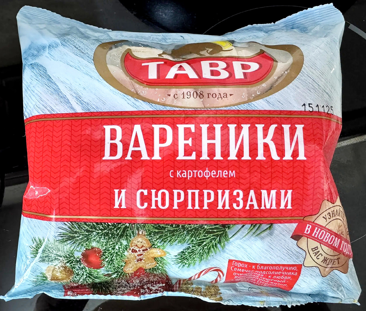 Варенички эти я прикупил еще до Нового года, хотел испытать удачу. А руки дошли до них только сейчас. Ну ничего, благополучия и счастья много не бывает.