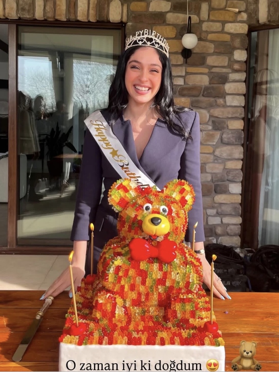 В разгар тяжелых съемок «Роз и грехов», в рабочем пиджаке и с растрепанными волосами, Джемре получила свой главный подарок. И нет, это не ключи от спорткара. Это... гигантский медведь из мармеладных мишек! 🧸