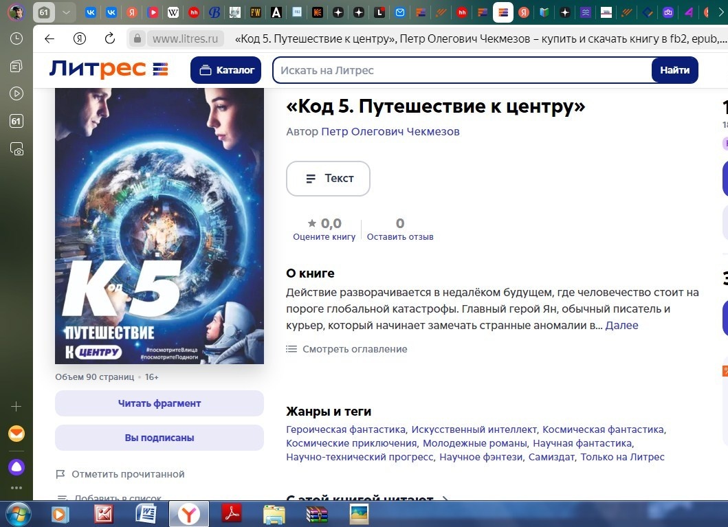 - Действие разворачивается в недалёком будущем, где человечество стоит на пороге глобальной катастрофы. Главный герой Ян, обычный писатель и курьер, который начинает замечать странные аномалии в работе Земли. Его расследование приводит к встрече с Таей талантливой студенткой космической станции, обладающей уникальным аналитическим мышлением. Вместе они обнаруживают, что ядро планеты испытывает серьёзные проблемы, а ключ к спасению кроется в объединении человеческих усилий и технологий. На их пути появляется загадочный искусственный интеллект Таша и мудрый отставной полицейский РМ, которые помогают героям раскрыть тайну спасения Земли. Подробнее: https://www.litres.ru/book/petr-olegovich-chekmezov/kod-5-puteshestvie-k-centru-73276984/