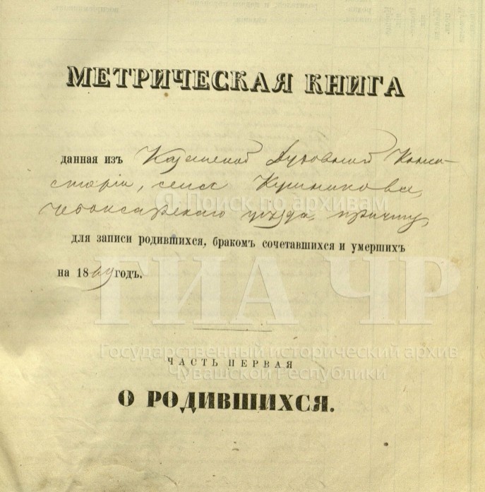 Метрические книги Преображенской церкви села Кушникова. 1 января 1860 — 31 декабря 1870 ГИА Чувашской Республики (ГИА ЧР), фонд № 225, опись № 3, дело № 133, стр. 887 скан. Метрическая книга, данная из Казанской духовной консистории Чебоксарского уезда села Кушникова в Преображенскую церковь причту для записки родившихся, браком сочетавшихся и умерших на 1869 год. Часть третия. О умерших. Стр. 978 скан. Апрель. № 16. 13 числа умерла. 15 числа отпета. Мариинского посада купца Трофима Несторова дочь младенец Евдокия. 2 месяцев. От младенческой. Таинство крещения совершил священник Алексей Соловьев. Дьячек Александр Смирнов. Пономарь Михаил Аристархов. https://yandex.ru/archive/catalog/a7eb8006-5a23-4a0d-999b-3ab7ef8a5d49/978