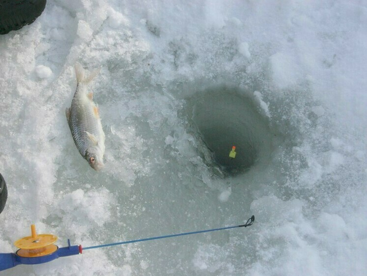 Поймав с утра те же пять подлещиков, я опять начал дергать мелкую плотву. Не дожидаясь массового наплыва этой заразы, сразу ушел на самую глубокую лунку. Но насадка не дошла до дна полтора метра и остановилась. После контрольной подсечки вынул все ту же плотву с палец. Да, теперь ты не даешь насадке даже опуститься на дно. При втором забросе все повторилось. Мормышка остановилась в полутора метрах над дном и на ней повисла рыба с палец. С третьего заброса удалось пробить слой мелочи и опустить мотыля на дно. Как только это произошло, поплавок тут же всплыл. После подсечки на леске почувствовалась приличная тяжесть.