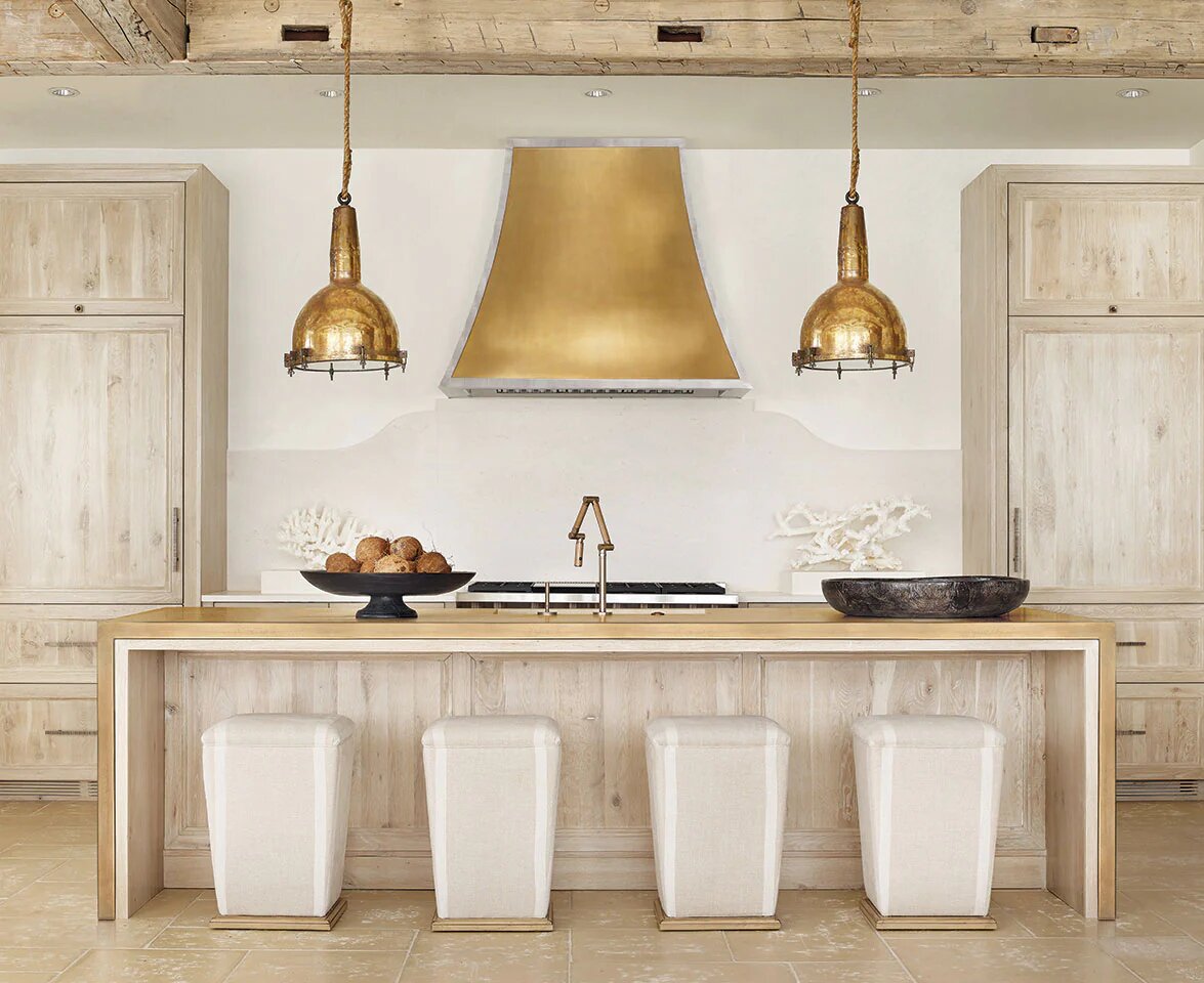 Кухонная столешница давно перестала быть просто рабочей поверхностью — это стильный элемент интерьера, который может задать характер всей кухни. В 2026 году дизайнеры предлагают уйти от типовых решений: сочетать эффектные материалы, выбирать нестандартные формы, умело сочетать функциональность и индивидуальность. Матовая латунь с естественной патиной — один из самых модных материалов для столешниц в этом году. Тёплый золотистый оттенок создаёт чувственный благородный визуальный эффект и отлично смотрится как на острове, так и в зоне готовки. Такой материал не боится царапин и прекрасно стареет. Сочетайте с деревянными фасадами или тёмными отделками для усиления контраста. Столешницы с расширением острова становятся универсальным пространством не только для еды, но и для работы или общения. Встроенные столешницы переходят в обеденные зоны или скамьи, создавая органичный «центр жизни» кухни. Кухню перестают рассматривать как утилитарное пространство — она становится местом, которое соче