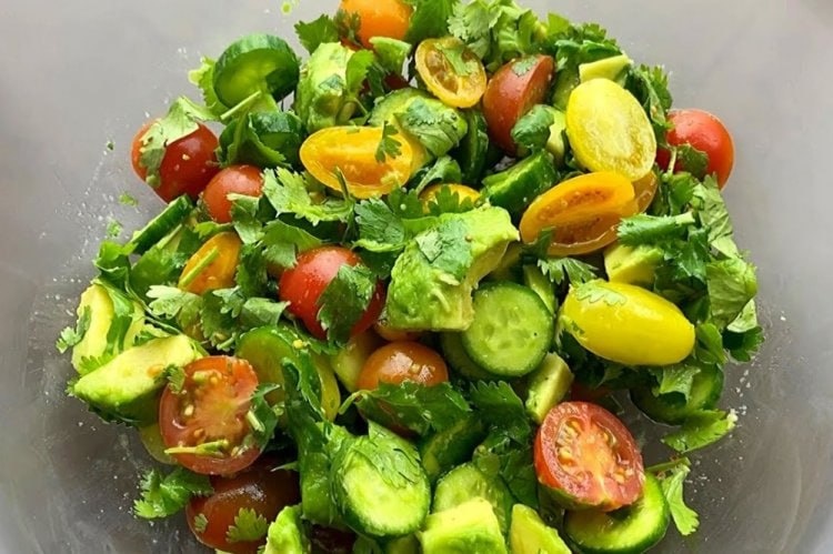 🥣♥️ Салат с авокадо, помидорами и огурцом Тебе понадобится: 2 авокадо, 2 огурца, 250 г красных помидоров, 250 г желтых помидоров, 1 фиолетовая луковица, 1 горсть рубленого базилика, 3 ст.л. соуса песто, 2 ст.л. лимонного сока, специи. Приготовление: Нарежь авокадо и помидоры тонкими дольками, лук – перьями, а огурцы – половинками кружочков. Добавь рубленый базилик. Для заправки смешай песто, лимонный сок и специи. 💖 Вкусная Жизнь