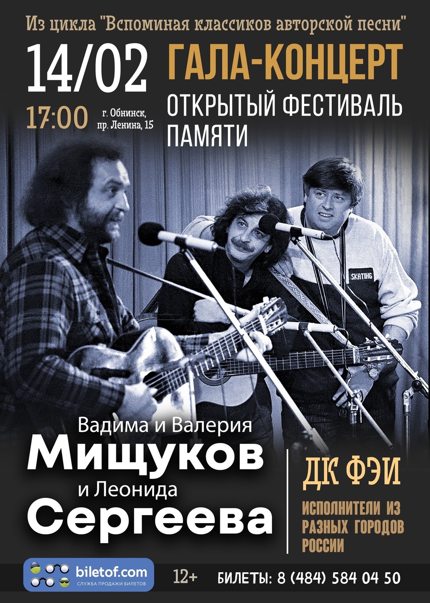 известных авторов‑исполнителей Вадима и Валерия Мищуков и Леонида Сергеева. Объединение это не случайно: они были друзьями и часто выступали в общих концертах, вместе записывали альбомы. Их песни — из тех, что сопровождают нас всю жизнь; они поются и в залах, и дома, в дружеском кругу, и у костра. Девиз фестиваля — «Вспомнить и узнать». Зрителей ждут как встречи с любимыми, хорошо известными песнями, так и настоящие открытия. По традиции в концерте принимают участие исполнители из разных городов России. В качестве жюри будут выступать: исполнители, лауреаты и члены жюри международных конкурсов авторской песни Дмитрий Беляков (Москва) и Зоя Иващенко (Обнинск); член Союза писателей России, лауреат международных фестивалей, художественный руководитель ТО «ОАЗИС» Оксана Рачкулик. 🎟Билеты в кассе (Вт-Сб с 13:00 до 19:00) или онлайне по ссылке: https://biletof.com/action/?ra=18643&frame=1. Для участия в фестивале необходимо ознакомиться с положением и заполнить заявку на участие 👉 https