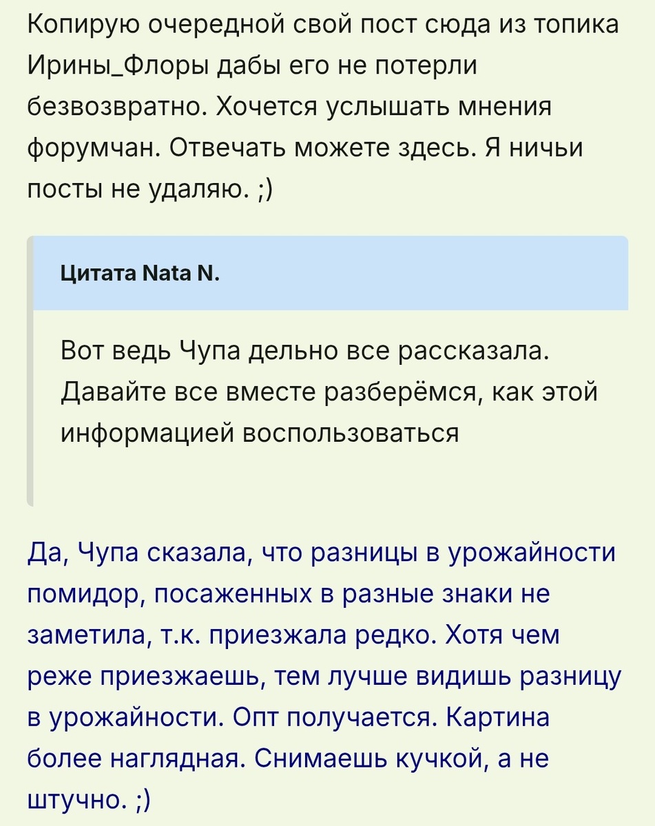 За год до эксперимента на форуме разгорелись нешуточные страсти. Особенно активно за Лунный календарь выступала Ирина Флора. Она буквально с пеной у рта доказывала, что Лунный календарь даст гарантированную прибавку в 30%.
