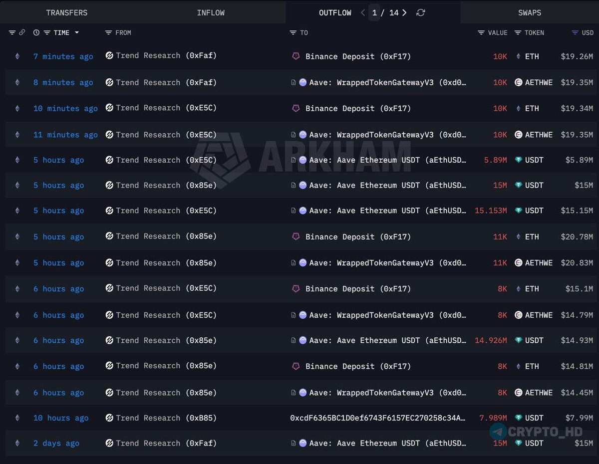 Компания Trend Research перевела 235,588 ETH ($516m) на биржу Binance за последние несколько дней (гасит займы на Aave)