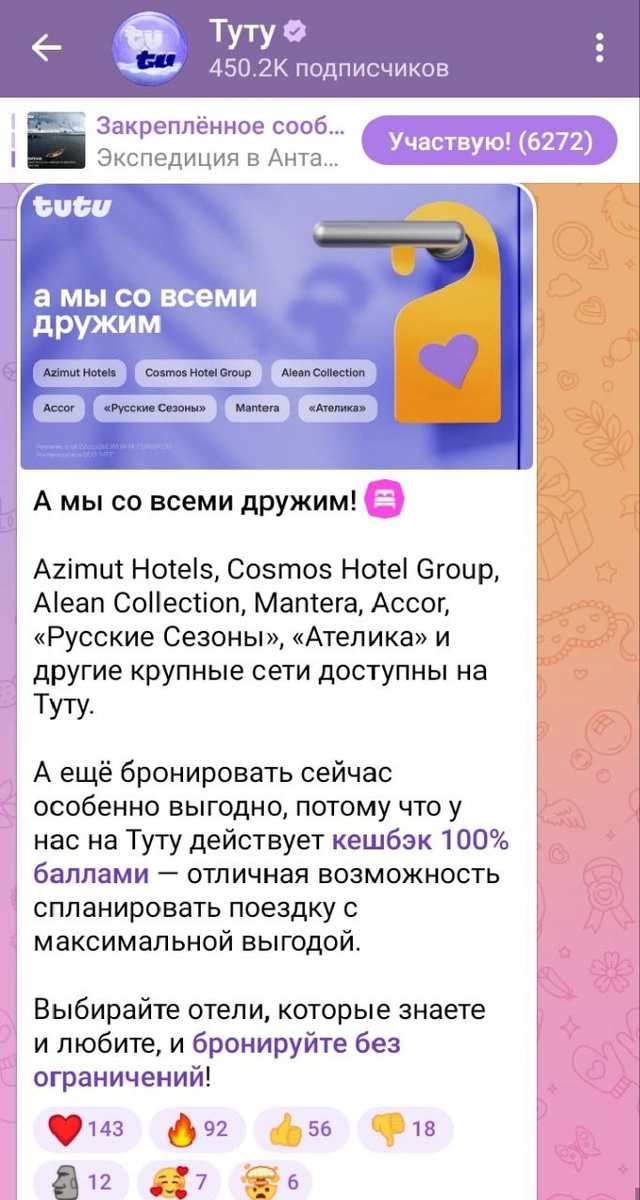 Как за этим интересно наблюдать! Пока одни стоят на своём, другие ловят момент. Как в старых добрых бургерных войнах 🍔 Коллеги не теряются: 🏝️Островок с хитрым прищуром 😏 намекает, где теперь искать ваши любимые сети отелей. И дарит промокод МОРОЗКО на -20%. 🚂Туту заявляет о всеобщей дружбе 🏨 со всеми крупными игроками и кешбэком в 100% баллами. Рынок - это всегда диалог. А когда одна сторона делает паузу, вторая тут же берёт слово. Сергей Скорбенко. Выручка отеля