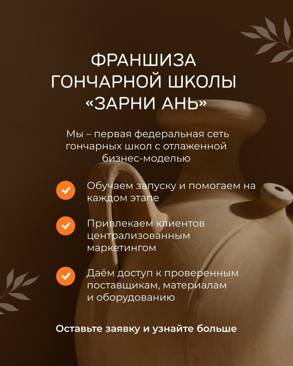 Вы давно мечтаете о своём деле, которое приносит не только доход, но и радость, вдохновение, возможность развиваться и вдохновлять других? Франшиза гончарной школы Зарни Ань — это ваш шанс начать успешный творческий бизнес с готовой моделью и поддержкой. Почему именно Зарни Ань? 🌟 Мы — одна из лучших гончарных школ в России с устойчивой клиентской базой и репутацией. 🌟 Полный пакет по запуску бизнеса: от обучения до маркетинга и операционной поддержки. 🌟 Готовые учебные программы, мастер-классы и авторские курсы, которые полюбили наши клиенты. 🌟 Возможность совместить бизнес с кофейней, как в Севастополе, создавая уникальное пространство для творчества и отдыха. Вложение во франшизу — это инвестиция в будущее, которое создаёте вы сами. И помните, в наших стенах рождаются не только красивые изделия, но и крепкие дружеские связи, вдохновение и положительные эмоции. Готовы начать? Подробнее о франшизе, условиях и преимуществах — на сайте zarny.ru/franchise Заполняйте заявку и присо
