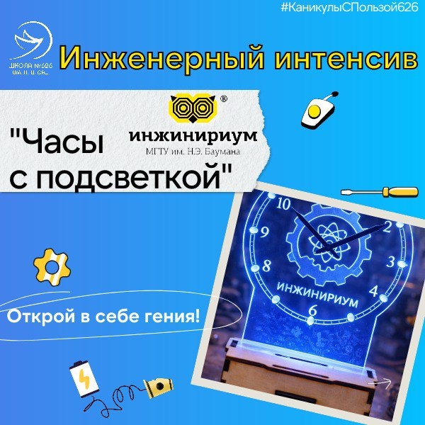 ) ⚙️ 🔝 На каникулах проведите время с пользой, погрузившись в мир технологий и изобретательства - приглашаем учеников 1-4 классов на увлекательный инженерный интенсив "Часы с подсветкой" от проекта МГТУ им. Н.Э. Баумана "Инжинириум". 💡 "Инжинириум" предлагает практико-ориентированный подход к обучению, где ребята не только приобретают твердые знания (hard skills), но и развивают важные навыки общения и работы в команде (soft skills). 🔩 В ходе интенсива ваши дети познакомятся с устройством часового механизма, узнают, что такое зубчатое зацепление, научатся проектировать кинематические пары в программе Компас, освоят работу в графическом редакторе и получат базовые знания в области схемотехники. 🏆 Финалом этого инженерного мастер-класса станет создание настоящих настольных часов с акриловым циферблатом и корпусом из фанеры, дополненных светодиодной подсветкой. Это не просто проект, а предмет гордости, который ребенок сможет показать своим друзьям и семье! 🗓 Программа курса (20