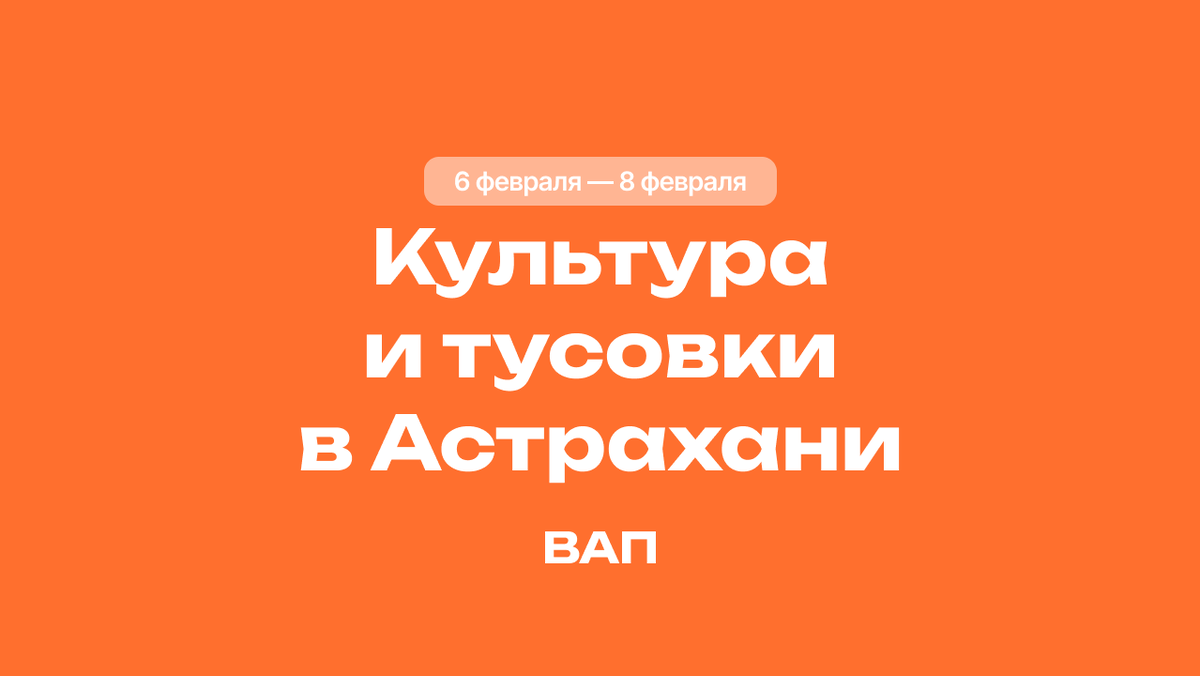 Собрали список интересных событий в Астрахани на грядущие выходные по дням. Рассказываем про спортивные, культурные и тусовки на 6-8 февраля. Вся афиша Астрахань здесь: театр, выставки, вечеринки и ресторанные дела. Ссылки для записи на события из подборки ищите в телеграм-канале медиа — В Астрахани что-то происходит с 9.00 в Региональном школьном технопарке 🖤 мастер-классы для 5-9 классов по лазерным технологиям, химии, робототехнике. Вход свободный, нужна запись (ссылка в тг-канале) с 11.00 в Dost 🌚 угощают ташкентским пловом по традиционному рецепту. Для улучшения аппетита рекомендуем почитать обзор ресторанцев на это кафе в канале 15.00 в видеозале на Кирова 🧸 Эхо фестиваля короткометражек. Покажут документальное кино 16.00 в Картинной галерее открытие выставки Марата Джамалетдинова🖤Счастье быть. Атмосферу зададут Vespero 17.00 в Диалектике 🌚 мастер-класс по актерскому мастерству. Упражнения на дыхание, речь, воображение и взаимодействию. 500₽, ссылка на билеты в канале 18