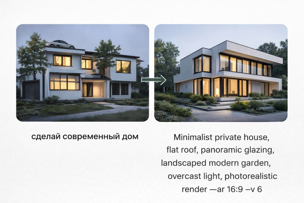 Когда ты пишешь что-то вроде «сделай современный дом»,ты даёшь нейросети почти полную свободу. Она не знает: жилой это дом или концепт, для рендера или для презентации, в каком масштабе и окружении.