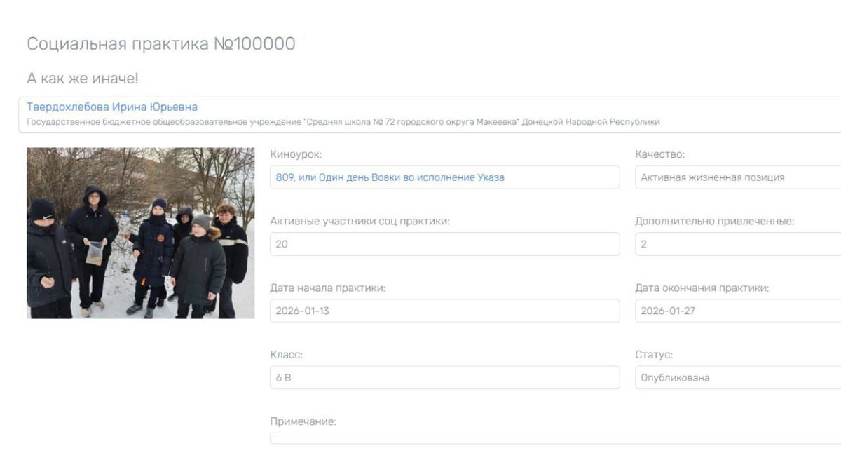 Стотысячная социальная практика, ставшая знаковым событием для проекта «О будущем», оказалась наполнена глубоким символическим смыслом. Её выполнение связано с целым рядом трогательных и важных обстоятельств. Во-первых, практика была проведена после просмотра фильма «809, или Один день Вовки во исполнение Указа», посвящённого качеству «Активная жизненная позиция». Это прямое свидетельство того, что проект участвует в выполнении важнейшего Указа Президента РФ, решая задачи государственной важности и идя в ногу со временем. Во-вторых, юбилейная практика пришла из города-героя Макеевки (ДНР), который более десяти лет живёт под обстрелами. Жители города, от мала до велика, ежедневно демонстрируют ту самую активную жизненную позицию, заботясь о своём городе, помогая нуждающимся и не оставляя без внимания животных. Педагоги Макеевки одни из самых активных участников системы воспитания «Киноуроки в школах России». Особую благодарность проект выражает руководителю городского Управления образ
