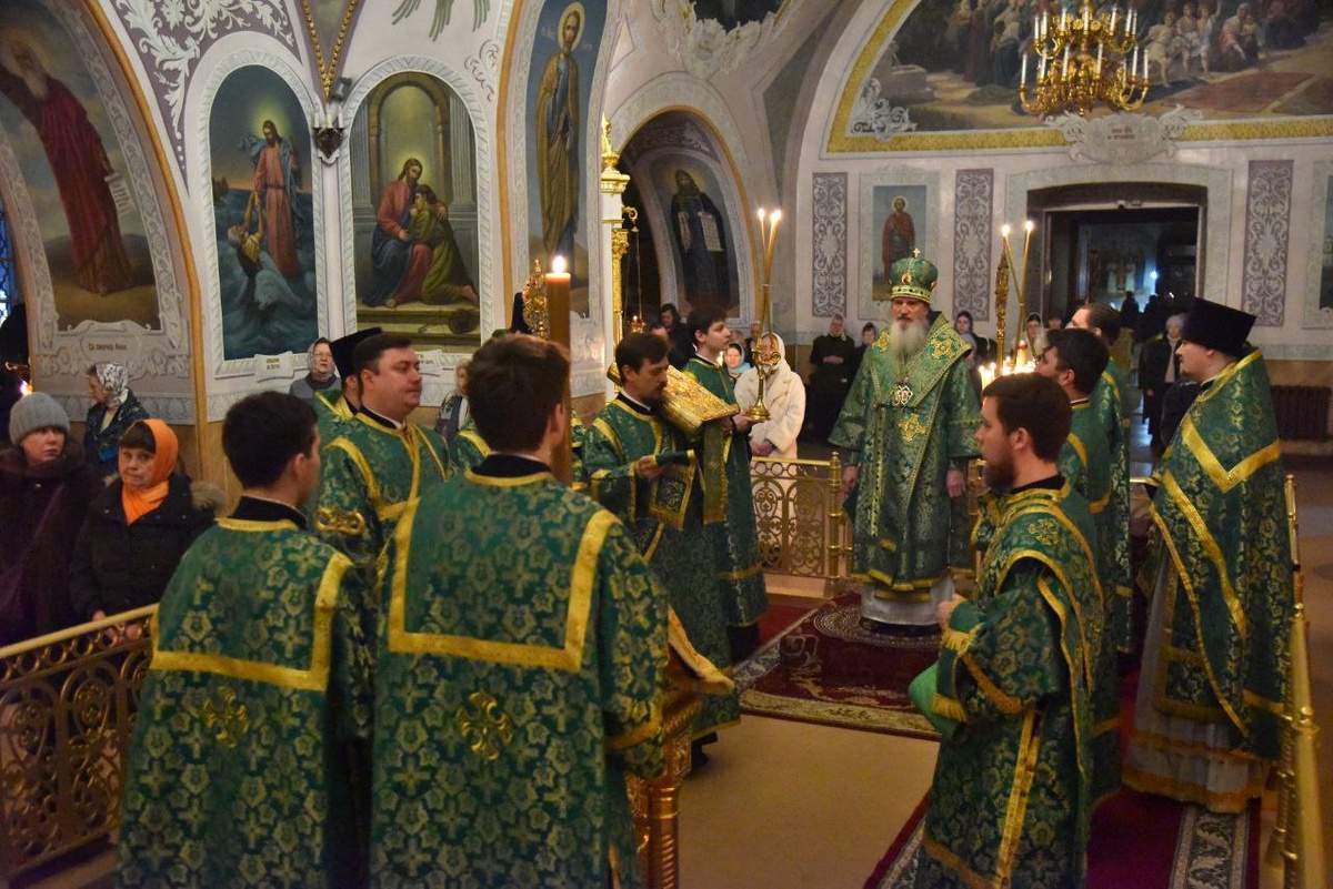 совершил Божественную литургию в кафедральном соборе святителя Николая Мирликийского. Его Высокопреосвященству сослужили иерей Александр Ромашков, иерей Артемий Лифинцев, иерей Ростислав Ильин, диаконы Георгий Качанкин, Никита Нефедов, Даниил Стрельцов. На сугубой ектении были добавлены особые прошения о воинстве российском, митрополит Пётр прочитал молитву о Святой Руси. Проповедь по запричастном стихе произнес иерей Артемий Лифинцев. Богослужебные песнопения исполнил архиерейский хор собора под управлением Светланы Храмовой. По заамвонной молитве архипастырь с духовенством совершили славление блаженной Ксении Петербургской, митрополит Пётр прочитал молитву ко святой. После отпуста архипастырь обратился к молящимся с проповедью.