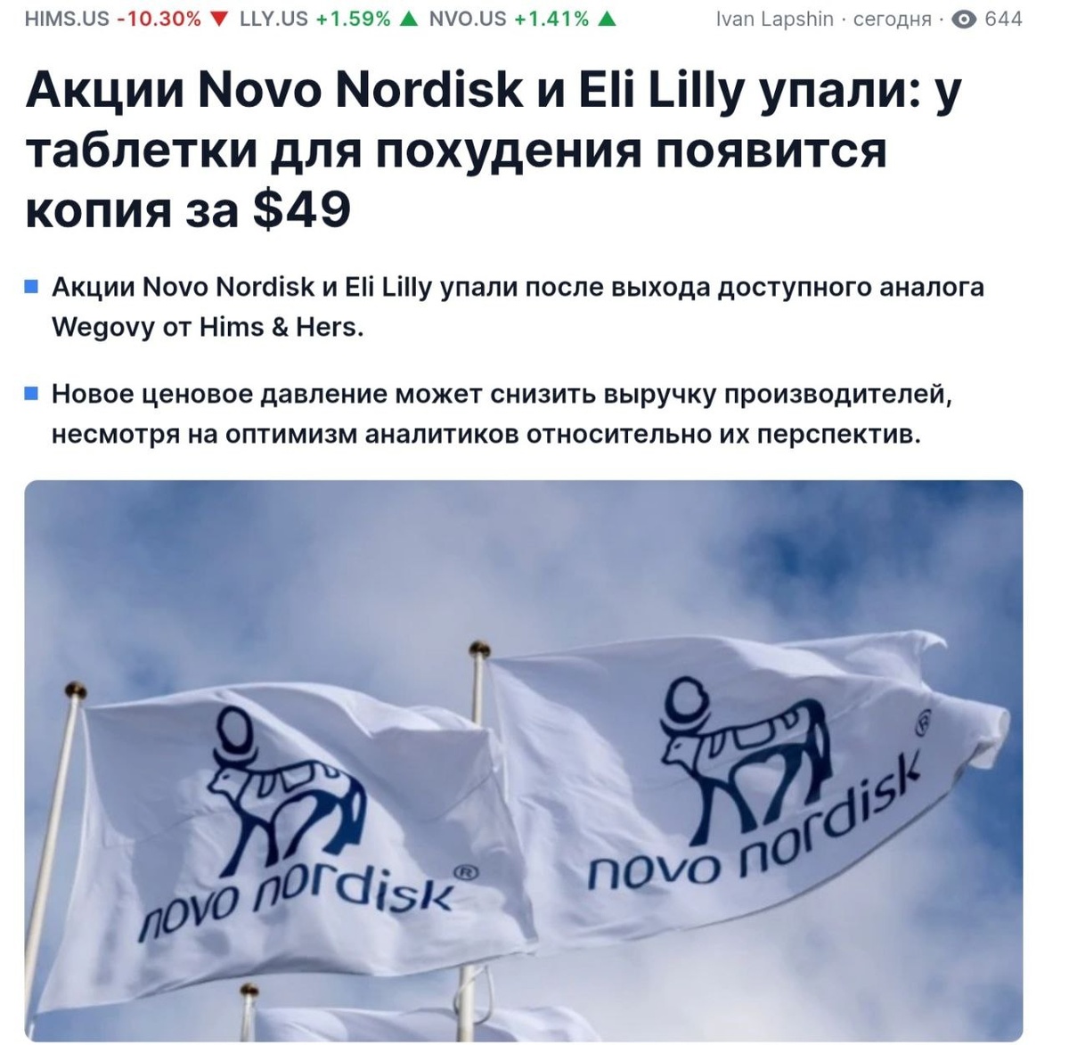 ΡΠ΄Π΅Π½ΠΈΡ Wegovy. ΠΡΠΈΡΠ΅ΠΌ ΡΡΠΎΠΈΡΡ ΠΎΠ½Π° Π±ΡΠ΄Π΅Ρ Π²ΡΠ΅Π³ΠΎ $49 β Π²ΡΡΠΎΠ΅ Π΄Π΅ΡΠ΅Π²Π»Π΅ ΠΎΡΠΈΠ³ΠΈΠ½Π°Π»Π° ΠΎΡ Novo, Π½Π° ΠΊΠΎΡΠΎΡΡΠΉ ΠΈΠ½Π²Π΅ΡΡΠΎΡΡ Π²ΠΎΠ·Π»Π°Π³Π°Π»ΠΈ Π±ΠΎΠ»ΡΡΠΈΠ΅ Π½Π°Π΄Π΅ΠΆΠ΄Ρ ADR Π΄Π°ΡΡΠΊΠΎΠ³ΠΎ ΡΠ°ΡΠΌΠ³ΠΈΠ³Π°Π½ΡΠ° Novo Nordisk #NVOΒ ΠΏΠΎΠ΄Π΅ΡΠ΅Π²Π΅Π»ΠΈ Π½Π° 8,2%. ΠΠ³ΠΎ Π°ΠΌΠ΅ΡΠΈΠΊΠ°Π½ΡΠΊΠΈΠΉ ΠΊΠΎΠ½ΠΊΡΡΠ΅Π½Ρ Eli Lilly #LLYΒ ΠΏΠΎΡΠ΅ΡΡΠ»Π° 7,8% ΡΡΠΎΠΈΠΌΠΎΡΡΠΈβοΈπ± ΠΠ½Π²Π΅ΡΡΠΎΡΡ ΡΠ°ΡΠΏΡΠΎΠ΄Π°Π²Π°Π»ΠΈ Π±ΡΠΌΠ°Π³ΠΈ Π΄Π²ΡΡ