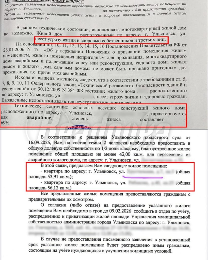 Администрация Ульяновска предложила одной из семей, у которой ребенок с диагнозом ДТП, переехать из аварийного дома в квартиру с тараканами и плесенью. Другие варианты находились на верхних этажах без лифта, а дверные проемы меньше размеров инвалидной коляски. Об этом Readovka поведала мать семейства. По ее словам, дом, в котором живет семья, признали аварийным еще 3 года назад. Однако администрация Ульяновска включила его в программу переселения лишь на 2030 год. Жильцы обратились в суд. После повторной экспертизы, проведенной в 2025, износ дома составил почти 70% и жить в нем опасно. Суд обязал власти предоставить семье благоустроенное жилье. Однако предложенные властями варианты оказались непригодны для жизни с ребенком-инвалидом, отметила женщина. В результате проблему не решил не выигранный суд, ни многочисленные обращения в администрацию Ульяновска. Мать также рассказала, что региональный Следственный комитет уже возбуждал уголовное дело по поручению председателя СК Александра Ба