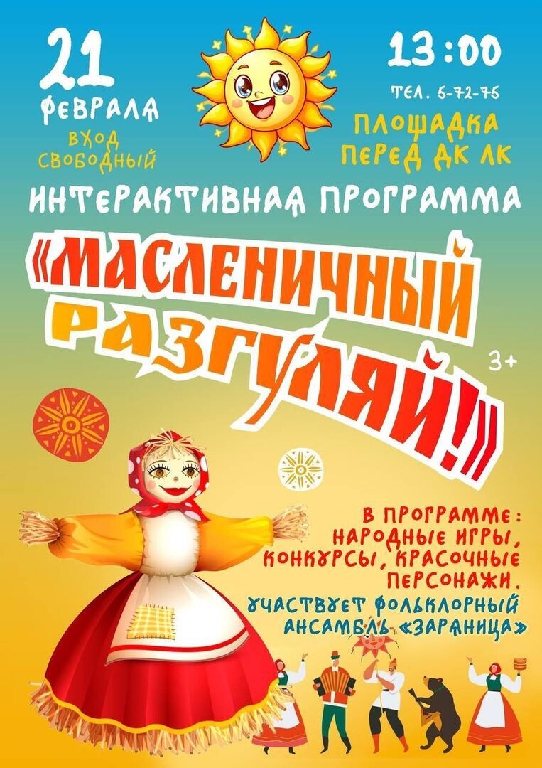 » 🎉 21 февраля в 13:00 Дом культуры Ленинского Комсомола проведёт интерактивную программу «Масленичный разгуляй». 🎭 В программе: выступление фольклорного ансамбля «Заряница», русский хоровод, персонажи для фото и гость Медведь Борис. ✨ Гостей ждут горячий чай из самовара и вкусные угощения. Вход свободный. 👉ВЛуки.ру