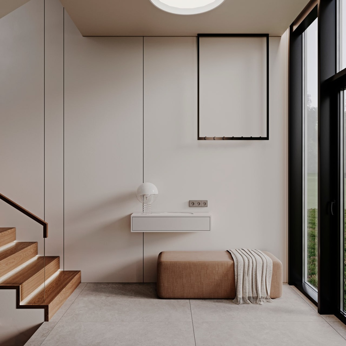 ”. Продолжение истории Практически всё в доме выполнено в шпоне. Он появляется в стеновых панелях, встроенной мебели, системах хранения, дверях. За счет этого интерьер читается как единое целое, а не как набор отдельных решений из разных каталогов. Цветовая палитра намеренно сдержанная: молочные, бежевые, тёпло-серые оттенки, древесные текстуры. Здесь нет резких контрастов. Материалы работают через нюансы и свет. На полу – широкоформатный керамогранит. Он проходит через основные зоны дома, визуально объединяя пространство и усиливая ощущение спокойного минимализма. Плюс – практичность, долговечность и комфорт в повседневной жизни. Гостиная стала центром дома💕 Она объединена с кухней и столовой. Встроенная мебель, чистые плоскости, мягкий рассеянный свет – пространство, в котором приятно находиться 24/7. В спальнях мы сделали акцент на тактильных ощущениях. Декоративная штукатурка, панели под покраску, панели с эффектом ткани. Санузлы поддерживают общую идею. Широкоформатный кера