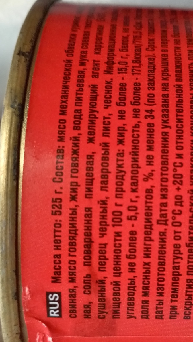 Смотрю на банку в полкило, смотрю на цену - не стыкуется (ну, просто, так не бывает, от слова "совсем" не бывает, советский период завершился три десятка лет назад). Да, думаю, прочту, что там написано, на банке - не тут-то было: говядина - крупно, особая - ярко, а вот состав (наимельчайшим шрифтом черного цвета на темно красном фоне) поди разбери. Взяла банку из любопытства (надо же понять, откуда ноги у этого чуда растут). Приезжаю домой, делаю фото, увеличиваю... Хохота сдержать не смогла... Это была первая реакция, волна негодования позже поднялась (это как на море - сначала ветер, потом волна).