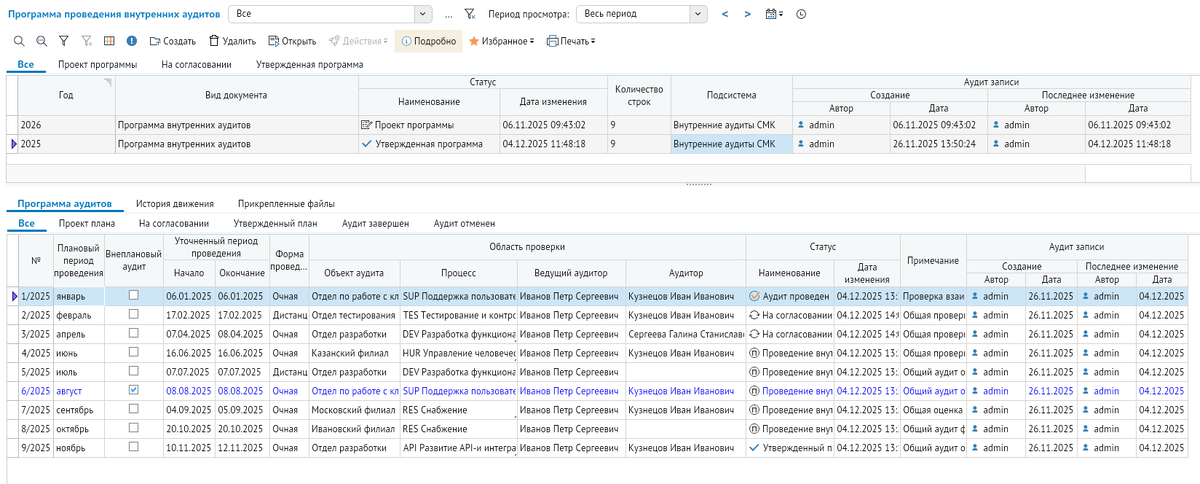 Внутренний аудит во многих компаниях воспринимается одинаково. Проверки, срочно заполненные таблицы и отчет, который нужен в первую очередь для галочки. В результате аудит нередко превращается в формальность и почти не влияет на реальные процессы. В АСМО-СМК внутренние аудиты рассматриваются как часть общей системы управления. Они связаны с целями компании, рисками и тем, что уже происходило в работе. Такой подход позволяет встроить аудит в повседневную деятельность и использовать его как инструмент улучшений, а не отдельную процедуру. Рассказываем, как это работает. Планирование аудиторской деятельности Работа с аудитами начинается с планирования и происходит сразу в системе. В АСМО-СМК формируется программа внутренних аудитов для предприятия или отдельных филиалов. Указывается год проведения, прикрепляются необходимые документы, сохраняется история изменений и этапы согласования. Внутри программы задаются конкретные пункты аудита. Определяется, какие процессы проверяются, какие объек