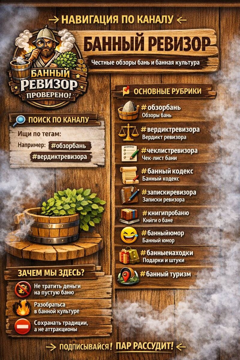 » Этот канал — не реклама и не глянец. Здесь я хожу в бани, смотрю на пар, людей и атмосферу — и выношу банный вердикт 🔍🔥 Если тебе важны: • настоящий пар, а не шоу • культура, а не анимация • честный взгляд без компромиссов — ты по адресу. 🔎 КАК ПОЛЬЗОВАТЬСЯ КАНАЛОМ В Telegram нажми 🔍 Поиск по каналу и введи нужный тег. Так ты быстро найдёшь нужные посты. Пример: #обзорбань или #вердиктревизора 📌 ОСНОВНЫЕ РУБРИКИ 🧖♂️ Обзоры бань #обзорбань Честные разборы общественных и частных бань Пар • парная • веники • атмосфера • люди ⚖️ Вердикт ревизора #вердиктревизора Коротко и по существу Рекомендую / не рекомендую / с оговорками 📋 Чек-лист бани #чеклистревизора По каким критериям я оцениваю бани Что важно, а что — вторично 📜 Банный кодекс #банныйкодекс Неписаные (и уже написанные) правила русской бани Для гостей, парильщиков и владельцев 📝 Записки ревизора #запискиревизора Личные наблюдения Мысли о банной культуре, традициях и перекосах 📚 Книги о бане #книгипробаню Что с