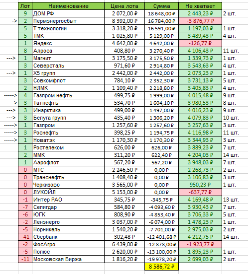 Приветствую вас на моем канале. Наступила пятница. Обычно в этот день я пополняю свой ИИС и покупаю акции. Но в связи с тем, что в предыдущие недели я перевыполнил план по пополнениям, сейчас у меня пауза во внесении денег на ИИС. Это касается только денег с зарплаты (накопительного счета). Но если появляются деньги от каких-то дополнительных источников дохода, то они по прежнему сразу отправляются на покупку акций. В среду, например, делал покупку на крупный донат от моего подписчика. Затем было пополнение на деньги полученные от игр в приложении Т банка. Но так как сегодня пополнений не предвидится, я решил провести небольшую рокировку в своем портфеле. В этом мне помогает моя таблица. В нижней части я вижу компании, которые таблица мне рекомендует продать. Это связано с тем, что они превысили выделенную им долю в портфеле. Некоторые из них там оказались вынужденно, после внесения в портфель новых акций. Их я во внимание не беру. Из оставшихся у меня Интер РАО, Селигдар, ЮГК, Ленэнер