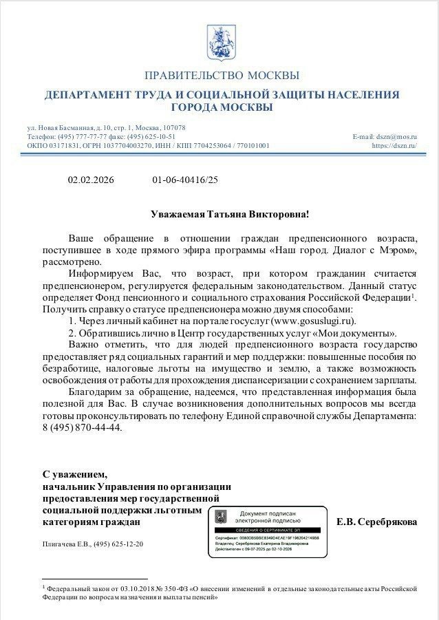 Получены прекрасные, совпадающие до запятых, ответы ни о чем на обращения к прямому эфиру "Наш город. Диалог с мэром", который состоялся 3 декабря. Выкладываю их часть, видимо, была рассылка по участникам чата предпенсионеров, т.к. ответы получили и те, кто не обращался. Приходится обращаться в прокуратуру. 29 августа 2018 года Владимир Владимирович Путин в обращении к гражданам России поддержал инициативу представителей партии «Единая Россия» в региональных законодательных собраниях и руководителей субъектов Федерации о сохранении всех действующих региональных льгот для предпенсионеров. http://kremlin.ru/events/president/news/58405 В Москве мнение Президента было учтено в законе № 19 от 26.09.2018 «О дополнительных мерах поддержки жителей города Москвы в связи с изменениями федерального законодательства в области пенсионного обеспечения». При обсуждении председатель МГД Алексей Валерьевич Шапошников особо подчеркнул, «что ВСЕ ПРЕДУСМОТРЕННЫЕ ЗАКОНОПРОЕКТОМ ЛЬГОТЫ НЕ ВРЕМЕННЫЕ, ОНИ