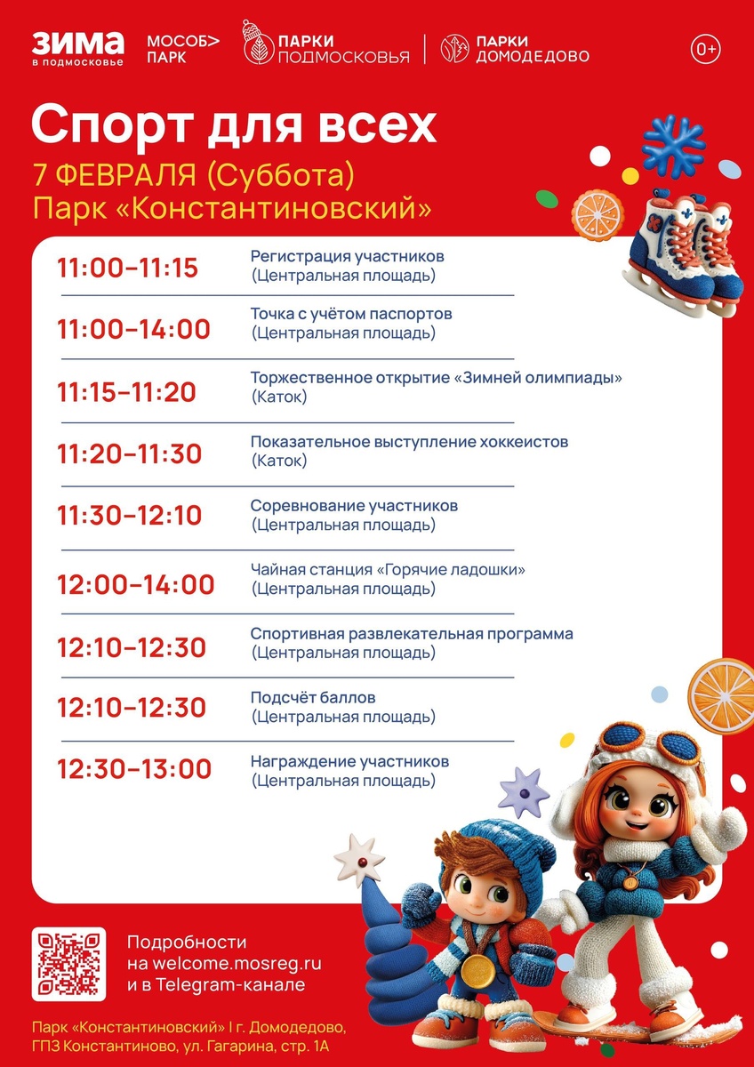 ✨ Спорт для всех - зимний праздник активного отдыха! 🏅❄️ Уже в эту субботу, 7 февраля, парк «Константиновский» и парк «Ёлочки» превратятся в центры спорта, движения и отличного настроения 🏃♀️ 📆 07.02.2026 ✅ Мероприятия Домодедово https://dzen.ru/id/66f10385cc4c5a16f7b5fb02 http://vk.com/domodedovo_events http://dzen.ru/domodedovo_events