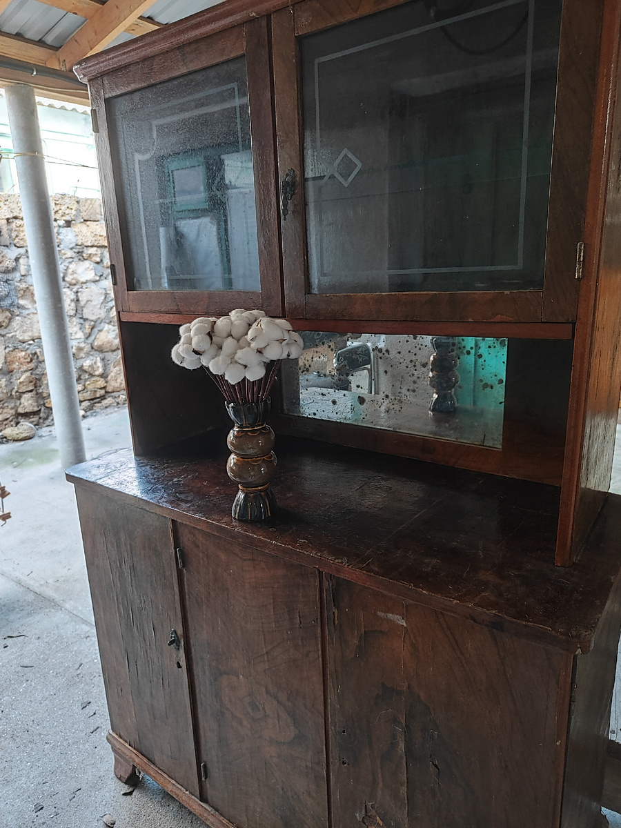 В целом он был ничего, только кусок шпона отлетел на дверце, нужны новые ручки, сломаны замочки и испортилось зеркало. Сам буфет не гнилой и крепкий.