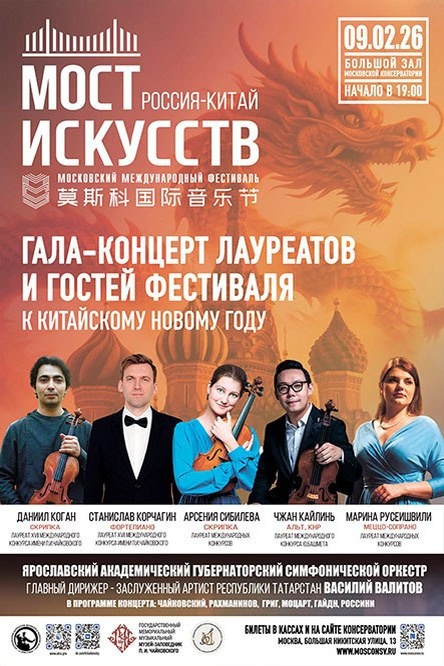границы. 🔖 9 февраля 2026 года, в преддверии Китайского Нового года, здесь состоится Гала-концерт, завершающий фестиваль «Мост Искусств. Россия-Китай». 🎶 Этот вечер станет кульминацией большого культурного диалога. На легендарную сцену выйдут самые талантливые молодые музыканты из России и Китая - лауреаты фестиваля, чей путь к этому выступлению лежал через строгий конкурсный отбор и серию концертов в лучших залах Москвы, Клина и Ярославля. 👏 Вместе с ними своё мастерство продемонстрируют и признанные звёзды академической сцены: Даниил Коган (скрипка) Станислав Корчагин (фортепиано) Марина Русеишвили (меццо-сопрано) 👏 В программе прозвучат бессмертные шедевры мировой классики: сочинения Чайковского, Рахманинова, Грига, Гайдна, Моцарта и Россини. 🎶 Истинным символом дружбы и единения двух великих культур станет совместное исполнение Концертной симфонии Моц Показать полностью...