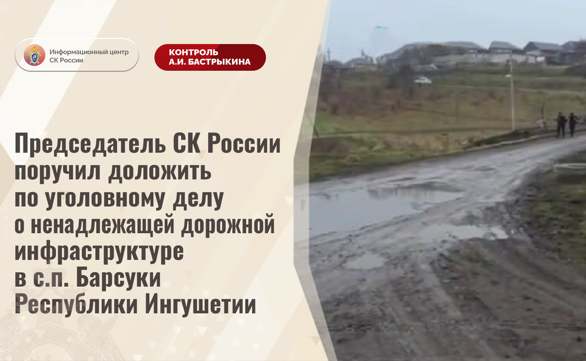 Председатель СК России поручил доложить по уголовному делу о ненадлежащей дорожной инфраструктуре в с.п. Барсуки Республики Ингушетии В сети Интернет сообщается о нарушении прав жителей сельского поселения Барсуки Республики Ингушетии на качественную дорожную инфраструктуру. Длительное время дорога на улице Картоева находится в непригодном состоянии: на поверхности образовались многочисленные ямы, грунтовое полотно в период выпадения осадков регулярно размывается. В связи с этим граждане не имеют возможности беспрепятственно добраться до школы, проезд транспортных средств также затруднен. В СУ СК России по Республике Ингушетии возбуждено уголовное дело. Председатель Следственного комитета Российской Федерации Александр Иванович Бастрыкин поручил руководителю СУ СК России по Республике Ингушетии Ахмеду Магомедовичу Асхабову доложить о предварительных и окончательных результатах расследования уголовного дела. Исполнение поручения поставлено на контроль в центральном аппарате ведомства. #