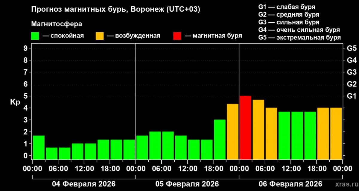 Жителям Воронежа стоит подготовиться к небольшому геомагнитному возмущению. Ученые прогнозируют магнитную бурю, которая начнется в ночь с четверга на пятницу, 6 февраля. По данным специалистов Института космических исследований и Института солнечно-земной физики, возмущения в магнитосфере достигнут пика около полуночи и будут классифицированы как слабая буря (уровень G1). После этого активность пойдет на спад, но геомагнитная обстановка останется неспокойной до утра пятницы. Новый всплеск ожидается вечером в субботу, 7 февраля. Причиной предстоящих магнитных возмущений стал недавний всплеск активности на Солнце. Во время подобных явлений метеозависимые люди часто жалуются на ухудшение самочувствия: головные боли, снижение концентрации, перепады настроения и повышенную утомляемость. Врачи рекомендуют в такие дни особенно внимательно относиться к своему здоровью: стараться высыпаться, избегать чрезмерных физических нагрузок, чаще бывать на свежем воздухе и не планировать важных дел, треб