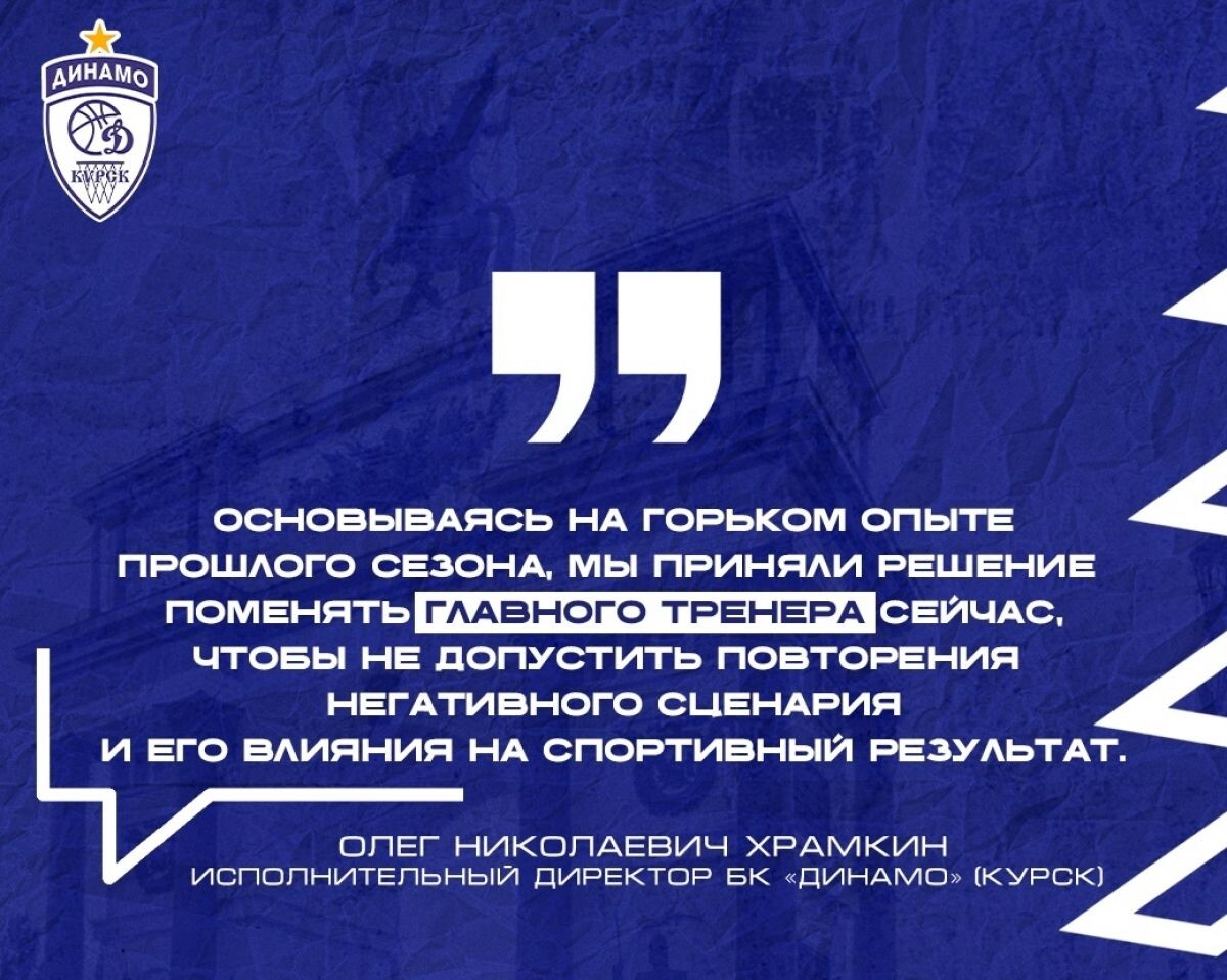 Баскетбольный клуб «Динамо» Курск объявил о смене главного тренера. Исполнительный директор Олег Храмкин прокомментировал это следующим образом: функционер подчеркнул, что это решение было обдуманным; на протяжении сезона руководство команды пыталось урегулировать возникшее недопонимание между тренером и командой, но в итоге это не удалось сделать: - Хочу подчеркнуть, что это решение не было спонтанным. На протяжении сезона мы старались контролировать наметившееся недопонимание между главным тренером и командой. К сожалению, в Сыктывкаре ситуация достигла своего пика. Основываясь на горьком опыте прошлого сезона, мы приняли решение поменять главного тренера, чтобы не допустить повторения негативного сценария и его влияния на спортивный результат. Также Храмкин подчеркнул, что этот шаг направлен на установление здоровой атмосферы в команде: - Мы глубоко убеждены, что только в условиях здорового микроклимата, взаимного уважения и полной концентрации на игре команда может раскрыть свой по