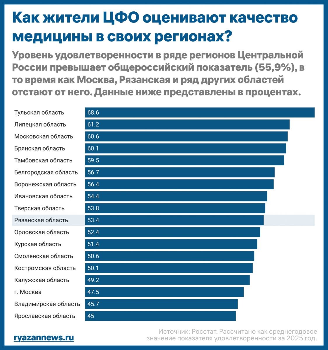 Рязанская область с показателем 53,4 процента заняла десятое место в ЦФО по удовлетворенности жителей медициной по итогам 2025 года. Это означает, что более половины опрошенных в регионе в той или иной степени довольны медпомощью. Расчёты произвели коллеги из «Ивановских новостей» по статистике Росстата. В лидерах — Тульская область, Липецкая область и Подмосковье. В конце списка, вопреки ожиданиям, оказалась Москва, вместе с ней Владимирская и Ярославская области. Показатель сложился из тех, кто в опросе выбрал варианты «удовлетворен» или «абсолютно удовлетворен».